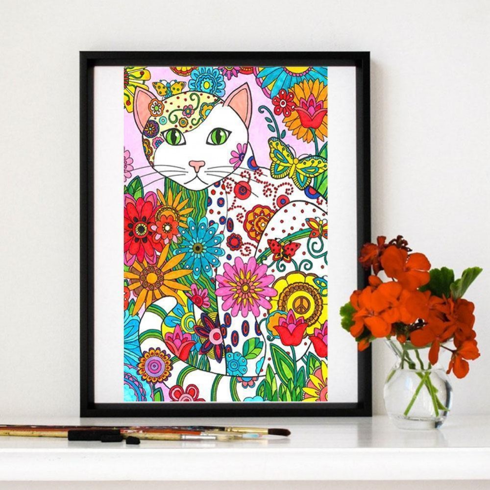 5D DIY Full Drill Diamond Painting?Cat Flowers Cross Stitch Embroidery Mosaic?Craft?Kit Wall Art Needlework Set Round Rhinestones Home Decor Gift